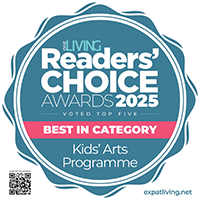 Badge showing Gold Winner for Six Cat Studios - Award is Best Kids' Enrichment Programme., 2022.